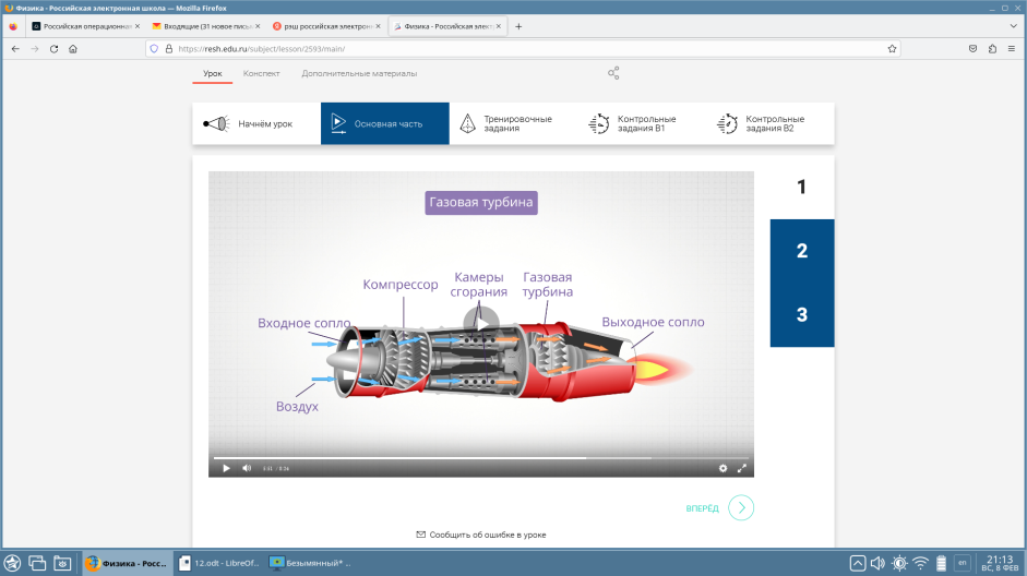 | Посмотрите фрагмент и ответьте на вопросы? Как влияет изменение температуры на давление и объем газа в камере сгорания согласно законам идеального газа? Как применяются законы Бойля-Мариотта и Шарля для описания процессов сжатия и расширения газа в компрессоре и турбине? | | https://resh.edu.ru/ |