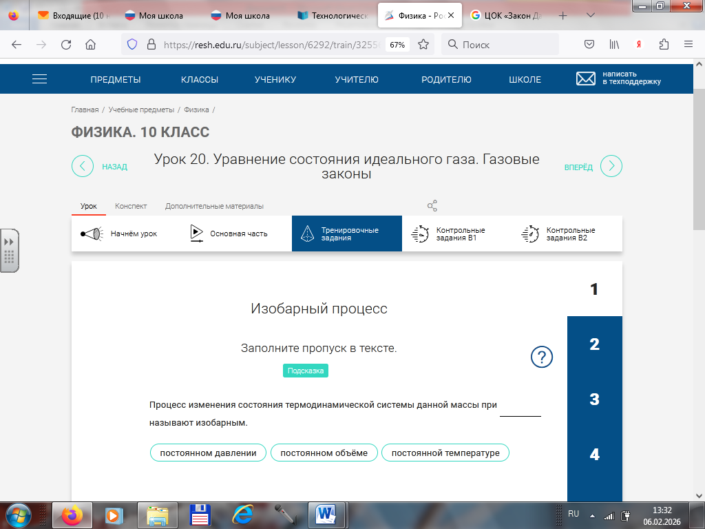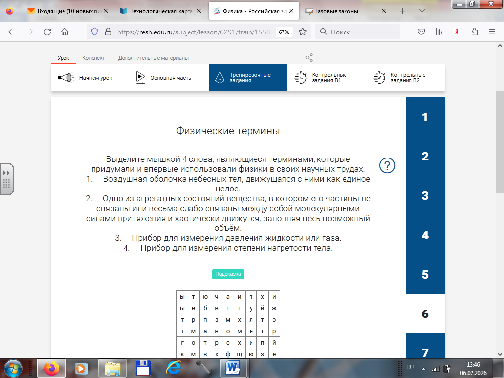 | 2 | Актуализация знаний | 4 мин | Для успешного изучения темы: « Газовые законы» важно вспомнить и закрепить базовые понятия, которые уже известны и будут использоваться. Задание 6 | | https://resh.edu.ru/ |