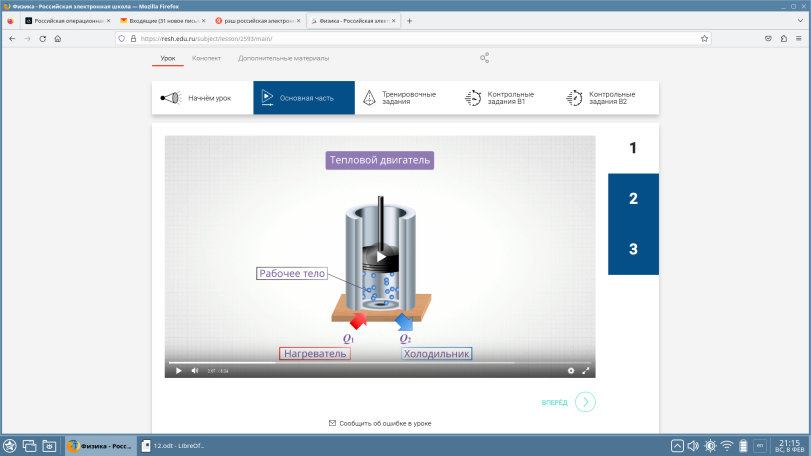 | 8 | Включение в систему знаний и повторение | 6 мин | Посмотрите фрагмент и ответьте на вопросы? Какой изопроцесс происходит в цилиндрах двигателя? Какое действие влечет воспламенение горючей смеси в дизельном двигателе? | | https://resh.edu.ru/ |