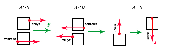 Работу вычисляют по формуле только в том случае, если направление силы постоянно и совпадает с направлением движения тела (F↑↑S). В этом случае работу силы считают положительной A0 (сила «разгоняет» тело).