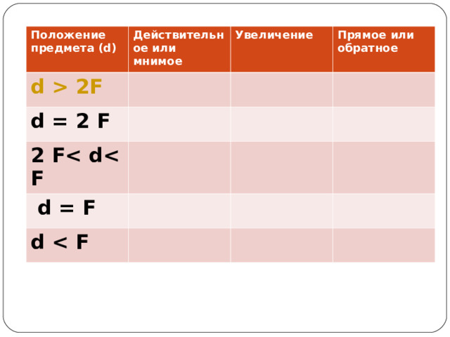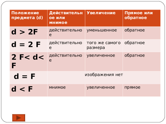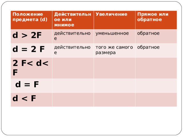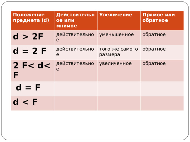 2F Увеличение d = 2 F действительное Прямое или обратное 2 F действительное уменьшенное обратное того же самого размера действительное d = F обратное увеличенное d обратное" width="640"