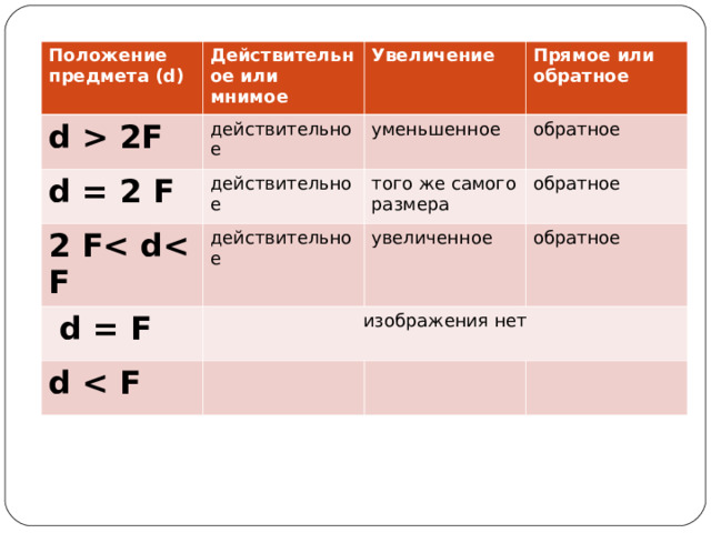 2F Увеличение действительное d = 2 F Прямое или обратное уменьшенное действительное 2 F d = F обратное того же самого размера действительное d изображения нет обратное увеличенное обратное мнимое увеличенное прямое" width="640"