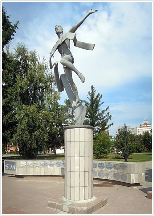 Вопрос 32. Как выглядит скульптура «Марафонца» установленная на Соборной площади в Омске? ( Марафонец пересекающий финишную ленточку. Бегун отлит из современного металла.)