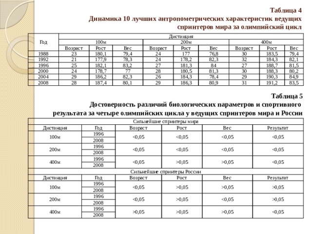 Таблица 4Динамика 10 лучших антропометрических характеристик ведущих спринтеров мира за олимпийский цикл