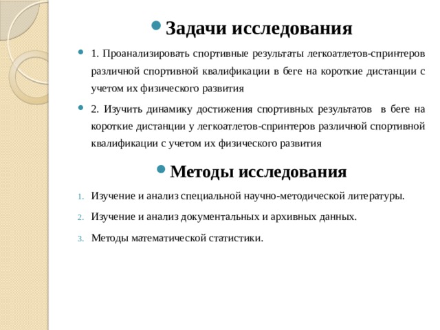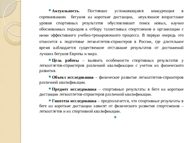 Гипотеза исследования – предполагается, что спортивные результаты в беге на короткие дистанции зависят от физического развития спортсменов – легкоатлетов и их спортивной квалификации.