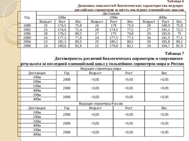 Таблица 6Динамика показателей биологических характеристик ведущихроссийских спринтеров за шесть последних олимпийских циклов