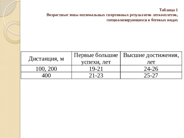 Таблица 1Возрастные зоны оптимальных спортивных результатов легкоатлетов, специализирующихся в беговых видах