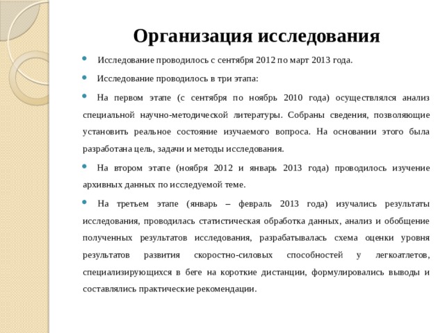 На третьем этапе (январь – февраль 2013 года) изучались результаты исследования, проводилась статистическая обработка данных, анализ и обобщение полученных результатов исследования, разрабатывалась схема оценки уровня результатов развития скоростно-силовых способностей у легкоатлетов, специализирующихся в беге на короткие дистанции, формулировались выводы и составлялись практические рекомендации.