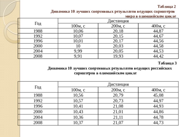 Таблица 2Динамика 10 лучших спортивных результатов ведущих спринтеровмира в олимпийском цикле