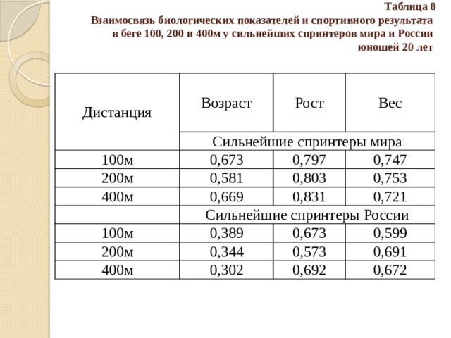 Таблица 8Взаимосвязь биологических показателей и спортивного результатав беге 100, 200 и 400м у сильнейших спринтеров мира и Россииюношей 20 лет