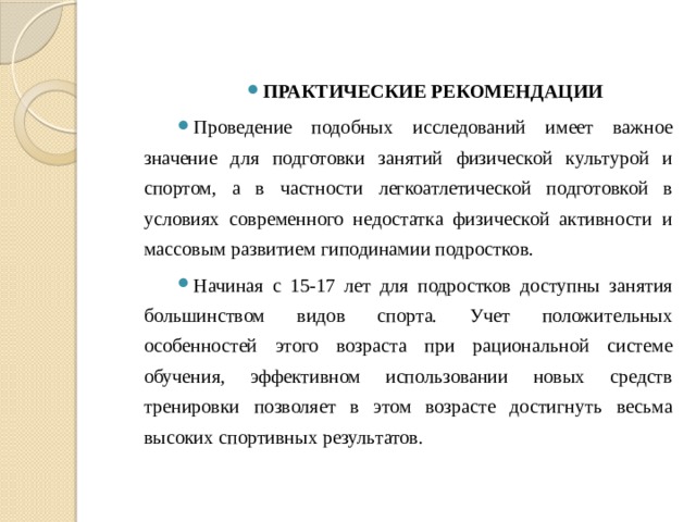 Проведение подобных исследований имеет важное значение для подготовки занятий физической культурой и спортом, а в частности легкоатлетической подготовкой в условиях современного недостатка физической активности и массовым развитием гиподинамии подростков.