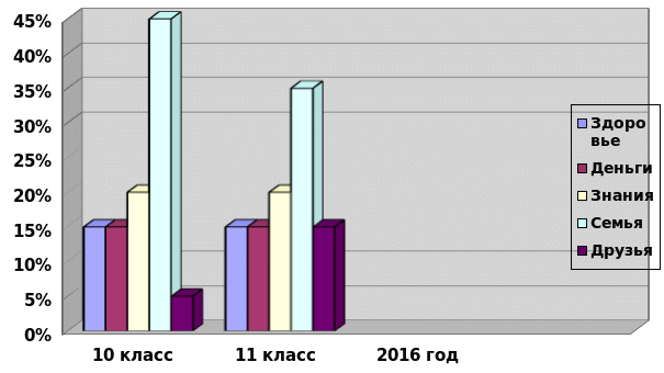 Для определения мотивации на здоровый образ жизни и отношения к собственному здоровью была использована методика «Ранжирование ценностей». В качестве основных ценностей для определения их значимости испытуемым были предложены такие компоненты как: здоровье, деньги, знания, семья и друзья. Исследуемые присваивали степень значимости по каждому из пунктов. В результате тестирования было выявлено, что здоровье не является преобладающей ценностью у учащихся. По количеству выборов позиций здоровье ставят испытуемые лишь на третью позицию. На первом преобладающем месте оказались позиции «семья» и «знания» (данные пункты поставили тестируемые на 1 место 35 - 45% испытуемых) и «знания», которым отдают предпочтение как главной ценности на данном этапе жизни (данный пункт выбрало 15% тестируемых).