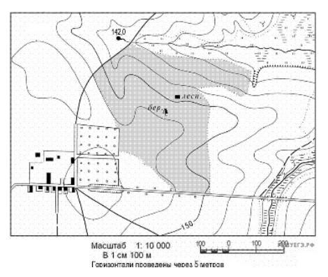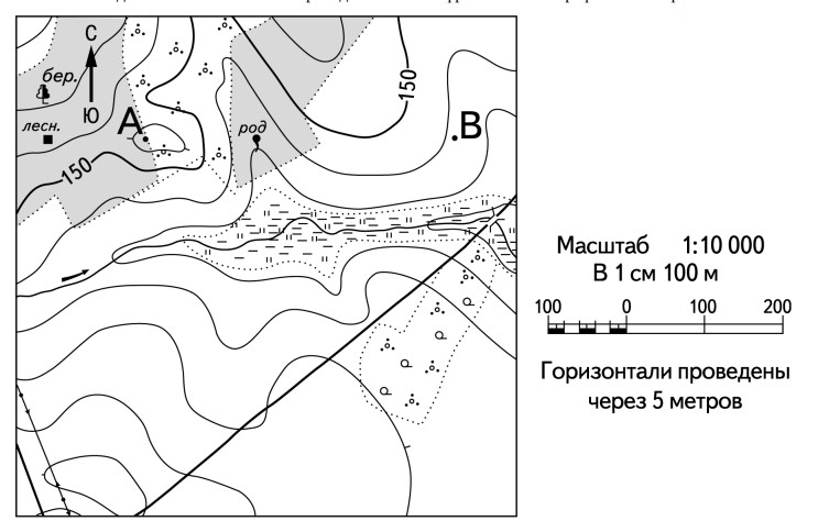 Задача: Постройте профиль местности по линии А – В, используя горизонтальный масштаб в 1 см 50 м и вертикальный масштаб в 1 см 5 м. Укажите знаком «Х» местоположение родника
