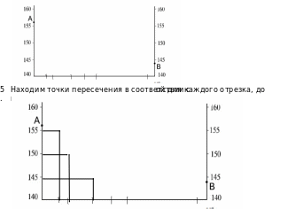 Измеряем расстояние от точки А до каждой горизонтали на линии АВ, в соответствии с масштабом умножаем его на 2 и откладываем точки на горизонтальном отрезке