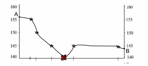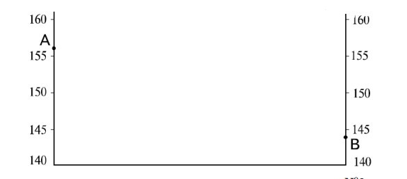 Чертим вертикали профиля с двух сторон полученного отрезка. Изначальное значение определяем по значениям горизонталей, расположенных ближе всего к точкам А или В. По плану местности видно, что ближайшая горизонталь к точке А имеет значение 155 м, а к точке В 140м. Значит, изначальное значение будет 140. Чертим вертикали с учетом вертикального масштаба в 1 см 5 м. отмечаем расположение точек А и В в соответствии с высотой.