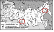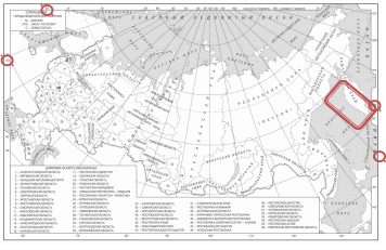 Определяем местоположение города. Для этого находим между какими параллелями и меридианами он находится: значение 59о 05' находится между 50-ой и 60-ой параллелями, а значение 159о 57' находится между 150-ым и 160-ым меридианами. Находим этот квадрат на карте России