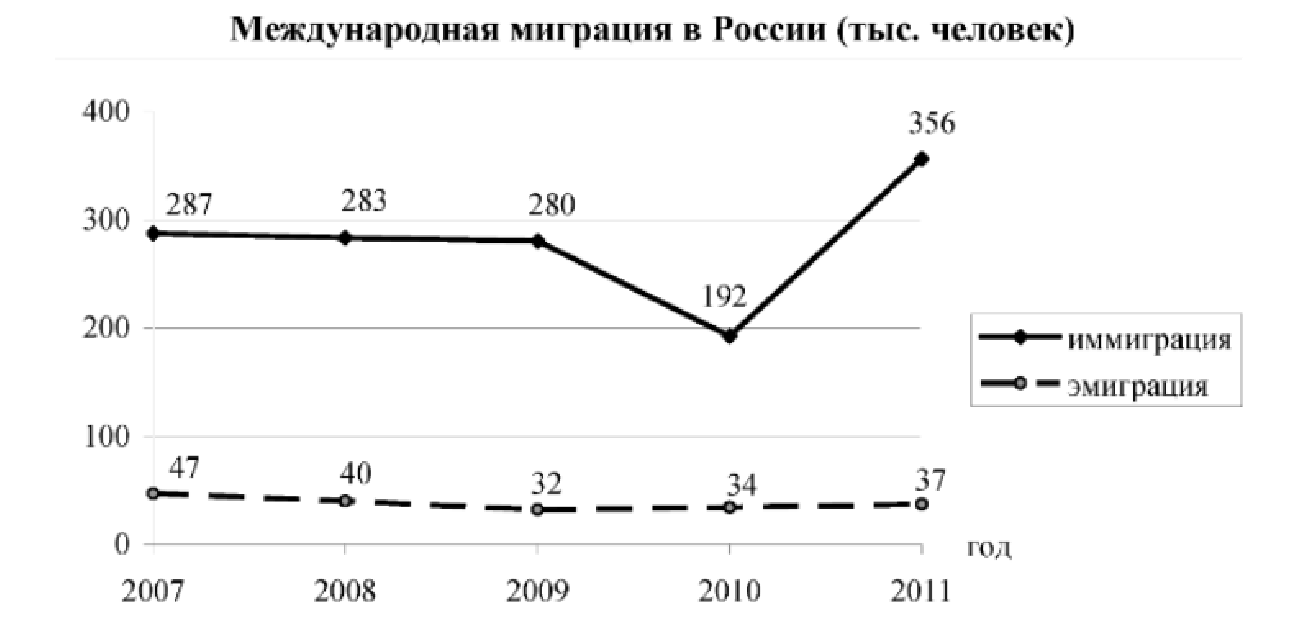 Задание: Используя график, определите показатель миграционного прироста населения в России в 2007 г. Ответ дайте в тысячах.