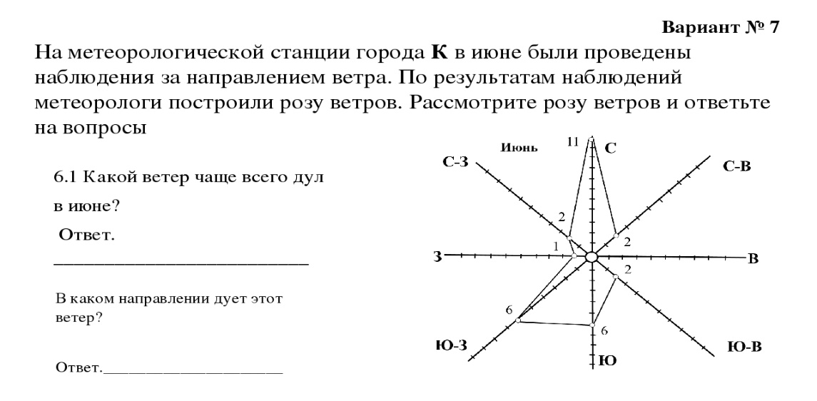 6 .На метеорологической станции города N в июле были проведены наблюдения за направлением ветра. По результатам наблюдений метеорологи построили розу ветров. Рассмотрите розу ветров и ответьте на вопросы