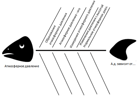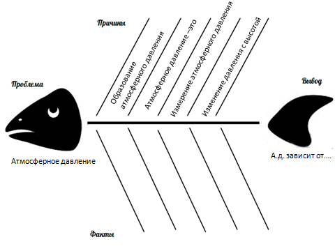 Работа в парах :. Всем учащимся раздается для анализа одинаковый текст и перед каждым ставится цель — заполнить схему «Рыбий скелет». Затем проходит обсуждение результатов, обмен мнениями и заполнение общей схемы на доске.