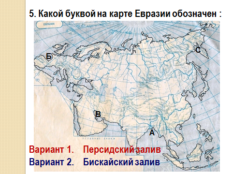 VII. Проверочный тест «Евразия» (вопросы в презентации). (Презентация).
