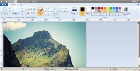 Paint в Windows 7 приобрел новый интерфейс, теперь инструменты разделены на ленте сверху окна, как в Microsoft Office Word. Лента содержит настройки, вкладку «Главная» и «Вид»
