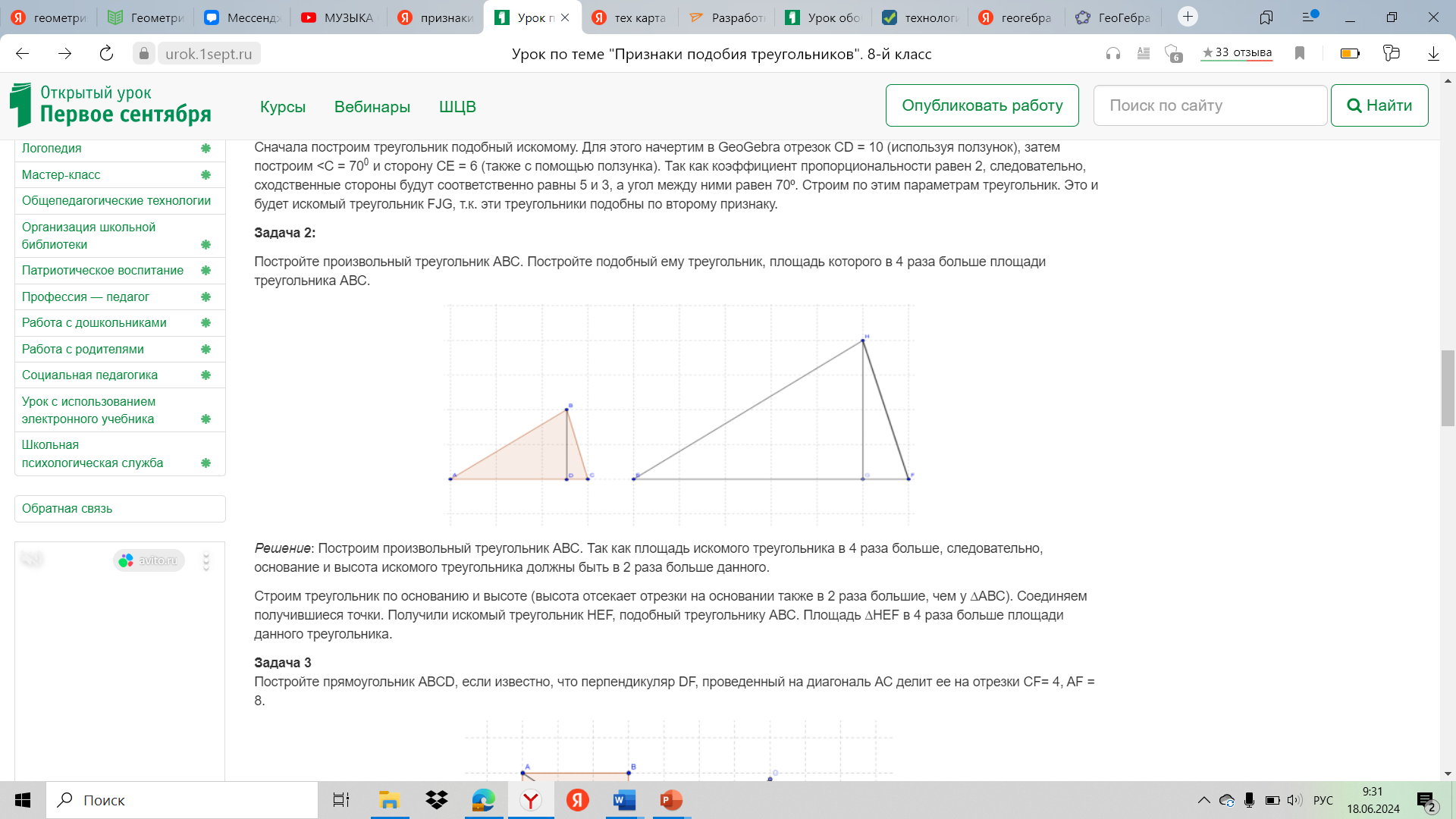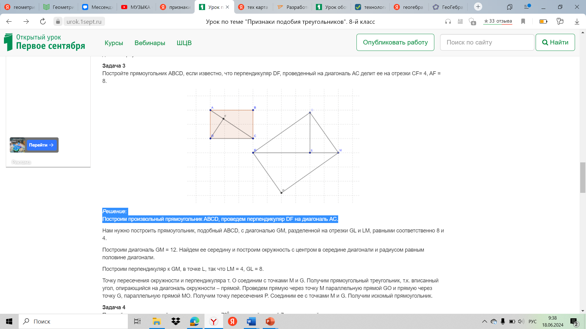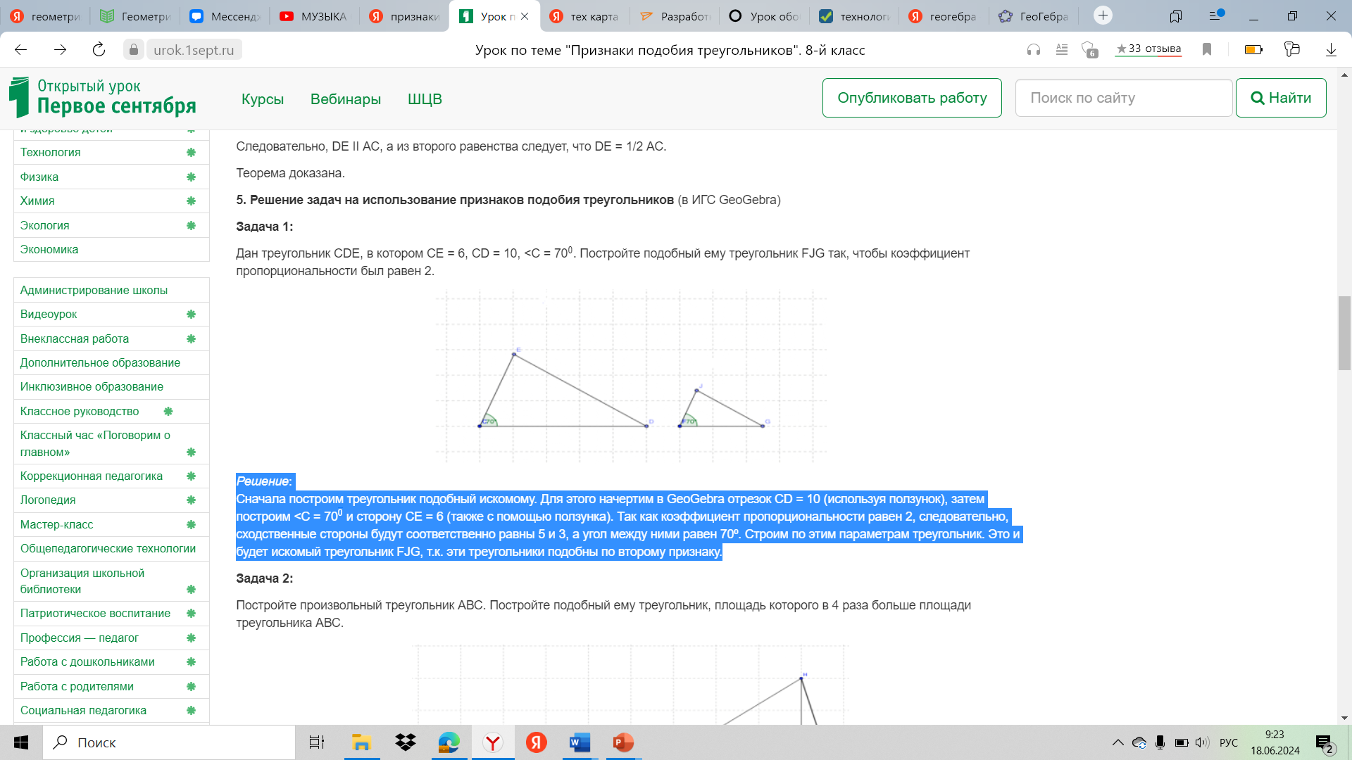 Реализация построенного проекта | - Сейчас я раздам Инструкцию для работы в GeoGebra, после чего вы берете с собой ее, карточку с заданием. У всех на компьютере уже открыта GeoGebra Задача 1: Дан треугольник СDE, в котором СЕ = 6, CD = 10, 0. Постройте подобный ему треугольник FJG так, чтобы коэффициент пропорциональности был равен 2. Решение: Сначала построим треугольник подобный искомому. Для этого начертим в GeoGebra отрезок CD = 10 (используя ползунок), затем построим Так как коэффициент пропорциональности равен 2, следовательно, сходственные стороны будут соответственно равны 5 и 3, а угол между ними равен 70⁰. Строим по этим параметрам треугольник. Это и будет искомый треугольник FJG. - По какому признаку они подобны? Задача 2: Постройте произвольный треугольник АВС. Постройте подобный ему треугольник, площадь которого в 4 раза больше площади треугольника АВС. - Молодцы, у вас очень хорошо получается. Задача 3 Постройте прямоугольник АВСD, если известно, что перпендикуляр DF, проведенный на диагональ АС делит ее на отрезки CF= 4, AF = 8. Решение: - Построим произвольный прямоугольник АВСD, проведем перпендикуляр DF на диагональ АС. - Теперь нам нужно построить прямоугольник, подобный АВСD, с диагональю GM, разделенной на отрезки GL и LM, равными соответственно 8 и 4. - Построим диагональ GM = 12. Найдем ее середину и построим окружность с центром в середине диагонали и радиусом равным половине диагонали. Построим перпендикуляр к GM, в точке L, так что LM = 4, GL = 8. Точку пересечения окружности и перпендикуляра т. О соединим с точками М и G. Получим прямоугольный треугольник, т.к. вписанный угол, опирающийся на диагональ окружности – прямой. Проведем прямую через точку М параллельную прямой GO и прямую через точку G, параллельную прямой МО. Получим точку пересечения P. Соединим ее с точками М и G. Получим искомый прямоугольник. | Записывают основные определения, слушают учителя. - эти треугольники подобны по второму признаку. Построим произвольный треугольник АВС. Так как площадь искомого треугольника в 4 раза больше, следовательно, основание и высота искомого треугольника должны быть в 2 раза больше данного. Строим треугольник по основанию и высоте (высота отсекает отрезки на основании также в 2 раза большие, чем у ∆АВС). Соединяем получившиеся точки. Получили искомый треугольник HEF, подобный треугольнику АВС. Площадь ∆HEF в 4 раза больше площади данного треугольника. | Регулятивные: - принятие и сохранение учебной задачи, - планирование своих действий в соответствии с поставленной задачей и условиями её реализации, Познавательные: - выделение существенной информации. |