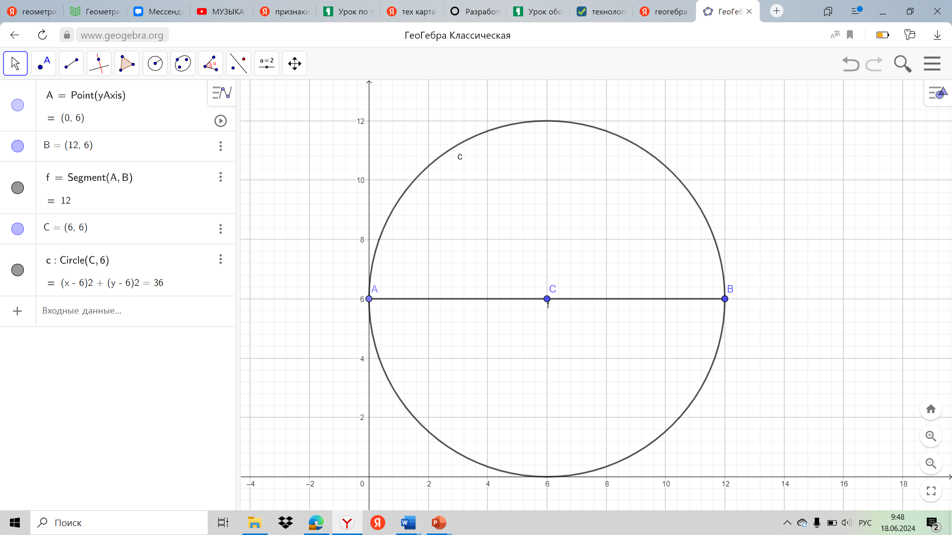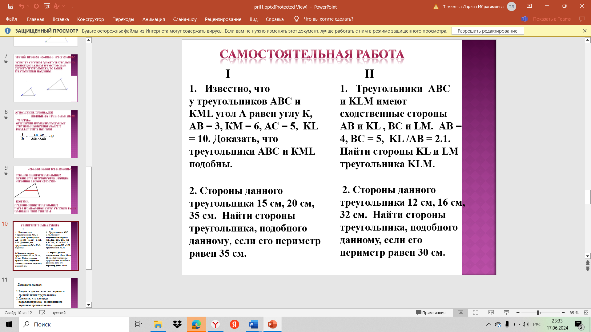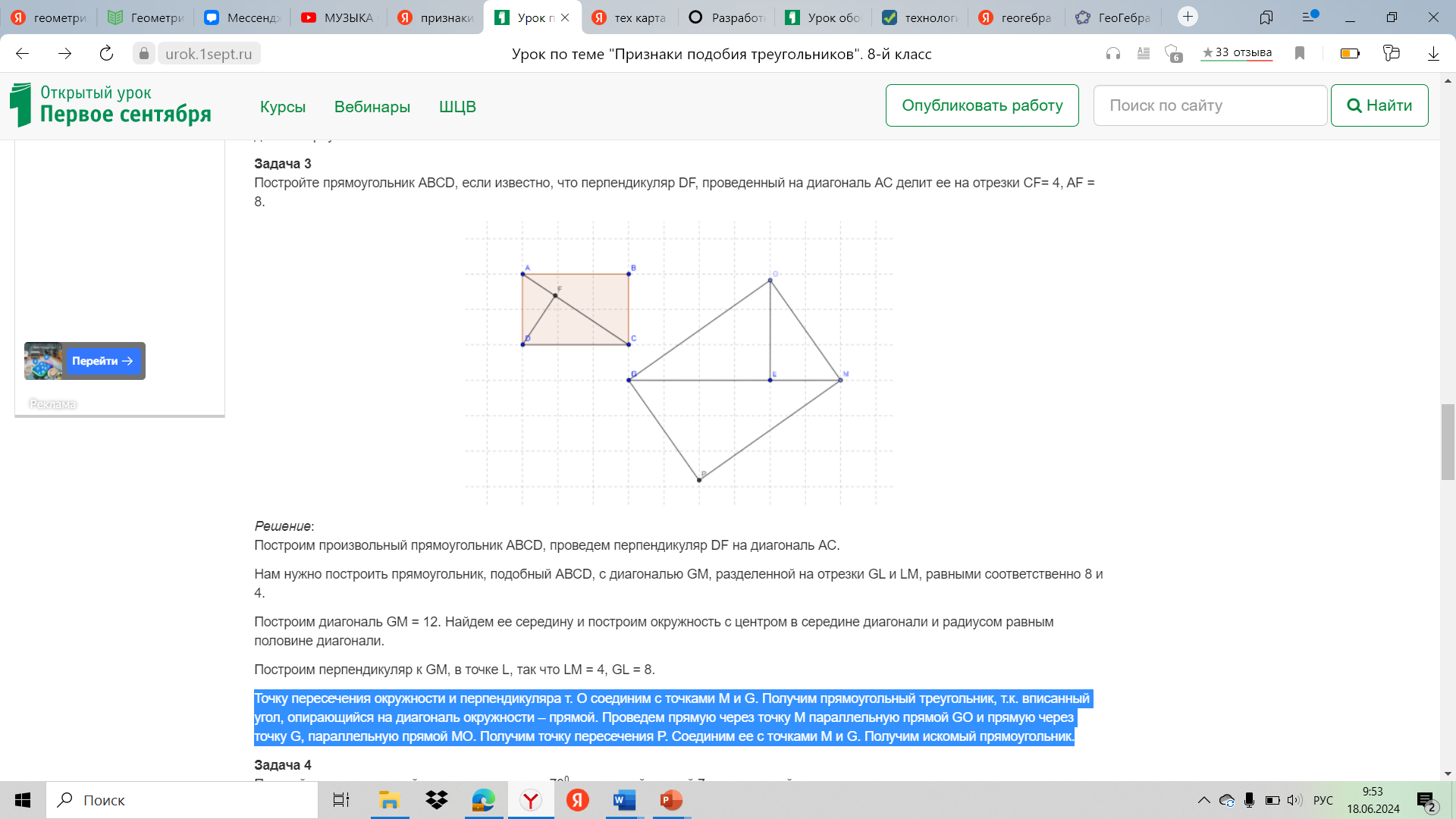 Реализация построенного проекта | - Сейчас я раздам Инструкцию для работы в GeoGebra, после чего вы берете с собой ее, карточку с заданием. У всех на компьютере уже открыта GeoGebra Задача 1: Дан треугольник СDE, в котором СЕ = 6, CD = 10, 0. Постройте подобный ему треугольник FJG так, чтобы коэффициент пропорциональности был равен 2. Решение: Сначала построим треугольник подобный искомому. Для этого начертим в GeoGebra отрезок CD = 10 (используя ползунок), затем построим Так как коэффициент пропорциональности равен 2, следовательно, сходственные стороны будут соответственно равны 5 и 3, а угол между ними равен 70⁰. Строим по этим параметрам треугольник. Это и будет искомый треугольник FJG. - По какому признаку они подобны? Задача 2: Постройте произвольный треугольник АВС. Постройте подобный ему треугольник, площадь которого в 4 раза больше площади треугольника АВС. - Молодцы, у вас очень хорошо получается. Задача 3 Постройте прямоугольник АВСD, если известно, что перпендикуляр DF, проведенный на диагональ АС делит ее на отрезки CF= 4, AF = 8. Решение: - Построим произвольный прямоугольник АВСD, проведем перпендикуляр DF на диагональ АС. - Теперь нам нужно построить прямоугольник, подобный АВСD, с диагональю GM, разделенной на отрезки GL и LM, равными соответственно 8 и 4. - Построим диагональ GM = 12. Найдем ее середину и построим окружность с центром в середине диагонали и радиусом равным половине диагонали. Построим перпендикуляр к GM, в точке L, так что LM = 4, GL = 8. Точку пересечения окружности и перпендикуляра т. О соединим с точками М и G. Получим прямоугольный треугольник, т.к. вписанный угол, опирающийся на диагональ окружности – прямой. Проведем прямую через точку М параллельную прямой GO и прямую через точку G, параллельную прямой МО. Получим точку пересечения P. Соединим ее с точками М и G. Получим искомый прямоугольник. | Записывают основные определения, слушают учителя. - эти треугольники подобны по второму признаку. Построим произвольный треугольник АВС. Так как площадь искомого треугольника в 4 раза больше, следовательно, основание и высота искомого треугольника должны быть в 2 раза больше данного. Строим треугольник по основанию и высоте (высота отсекает отрезки на основании также в 2 раза большие, чем у ∆АВС). Соединяем получившиеся точки. Получили искомый треугольник HEF, подобный треугольнику АВС. Площадь ∆HEF в 4 раза больше площади данного треугольника. | Регулятивные: - принятие и сохранение учебной задачи, - планирование своих действий в соответствии с поставленной задачей и условиями её реализации, Познавательные: - выделение существенной информации. |