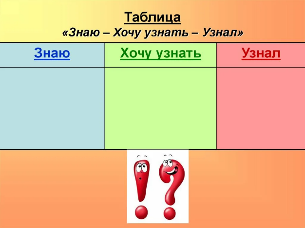 Этап выявления места и причины затруднений | - У вас на столе лежит таблица ЗХУ. Заполните первые два столбца. | Заполняют таблицу. | Коммуникативные: - использование речи для регуляции своих действий. Познавательные: - структурирование знаний, - установление причинно-следственных связей, - построение рассуждения в форме связи простых суждений об объекте, его строении, свойствах и связях. |