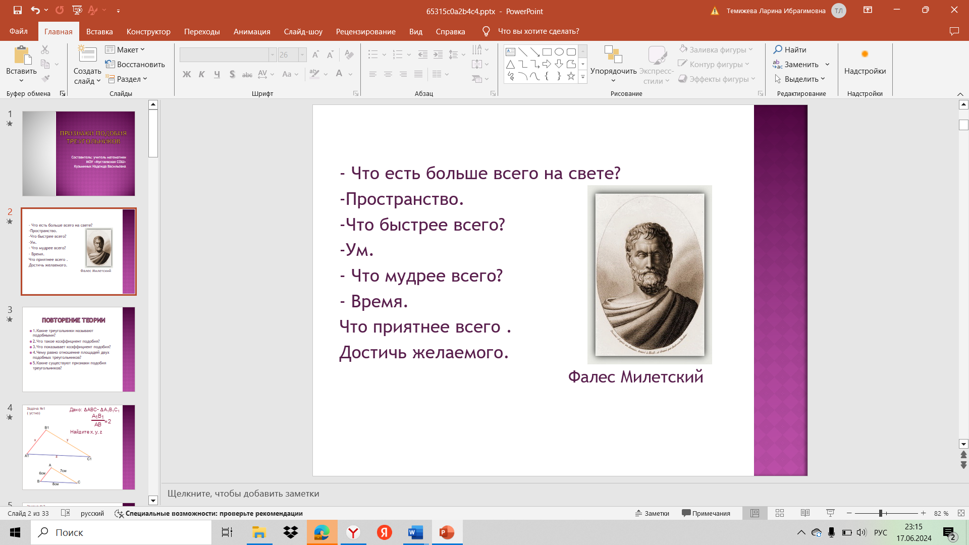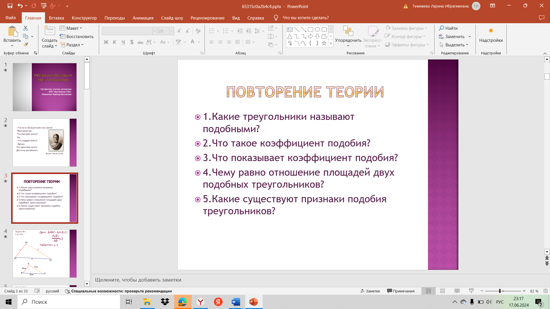 Актуализация и фиксирование индивидуального затруднения в пробном действии | - Давайте вспомним основные теоретические понятия, которые сегодня нам с вами будут необходимы при решении задач. Демонстрация презентации. - теперь попробуйте решить самостоятельно задачи | Ребята отвечают на вопросы, вспоминают тему. - Подобные треугольники — это треугольники, у которых все углы равны между собой, а их стороны пропорциональны. - Коэффициент подобия треугольников — это число k, которое равно отношению соответствующих сторон треугольников. - показывает, во сколько раз стороны одного треугольника больше сторон другого -Отношение площадей двух подобных треугольников равно квадрату коэффициента подобия. - Первый признак подобия треугольников: если два угла одного треугольника соответственно равны двум углам другого, то такие треугольники подобны. Второй признак подобия треугольников: если две стороны одного треугольника пропорциональны двум сторонам другого треугольника и углы, образованные этими сторонами, равны, то такие треугольники подобны. Третий признак подобия треугольников: если три стороны одного треугольника пропорциональны трём сторонам другого, то такие треугольники подобны. Решают задачи, сталкиваются с затруднениями. | Коммуникативные: - формулирование собственного мнения, Познавательные: - умение строить речевое высказывание, Регулятивные: - различение способа и результата действий. |