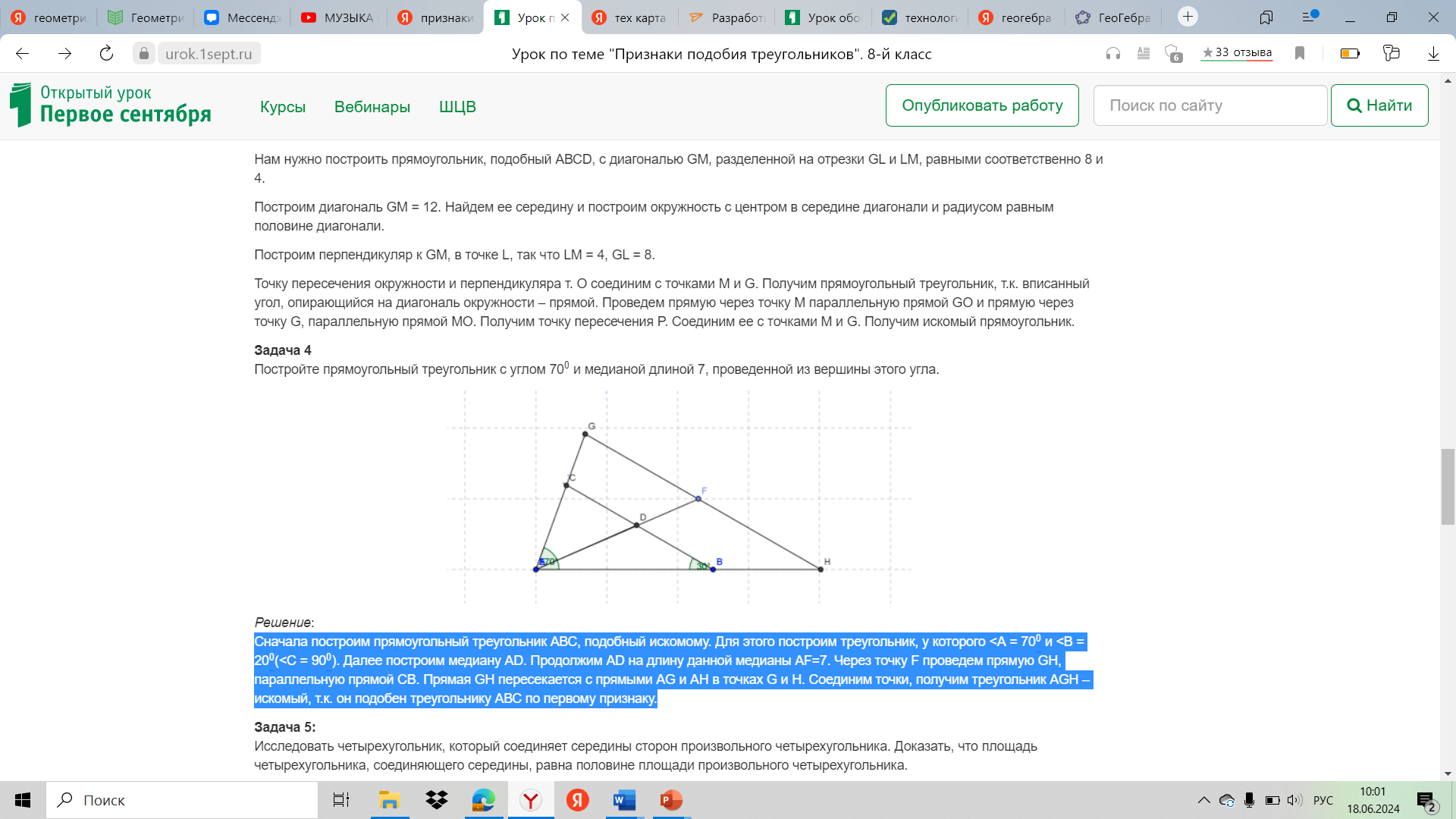 Этап первичного закрепления с проговариванием во внешней речи | -Решите задачу обязательно проговаривая каждый этап, объясняя и аргументируя свои действия Задача 4. Постройте прямоугольный треугольник с углом 700 и медианой длиной 7, проведенной из вершины этого угла. | Сначала построим прямоугольный треугольник АВС, подобный искомому. Для этого построим треугольник, у которого | Коммуникативные: - использование речи для регуляции своего действия, - построение монологического высказывания. Регулятивные: - принятие и сохранение учебной задачи, - учёт правила в планировании и контроле способа решения, различение способа и результата действия. Познавательные: - использование знаково-символических средств, в том числе моделей и схем для решения задач. |