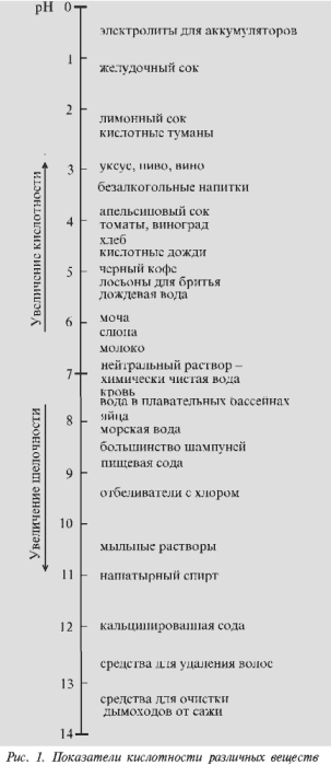 Шкала кислотности идет от рН = 0 (крайне высокая кислотность) через рН = 7 (нейтральная среда) до рН = 14 (крайне высокая щелочность). Показатель кислотности рН различных веществ, встречающихся в повседневной жизни, приведен на рис. 1.