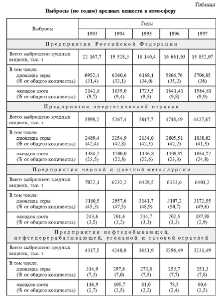С ледует отметить, что при наметившейся в 1990-е гг. в России тенденции снижения выбросов загрязняющих веществ промышленными предприятиями (см. табл.) доля диоксида серы и оксидов азота в этих выбросах увеличивается.