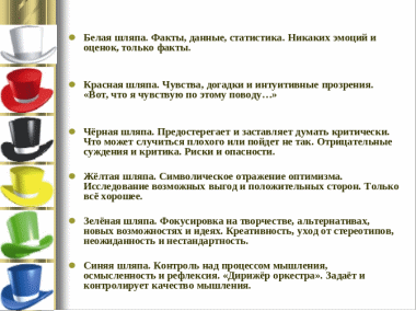 шляпами разного цвета. «Надевание» шляпы фокусирует мышление, «смена»