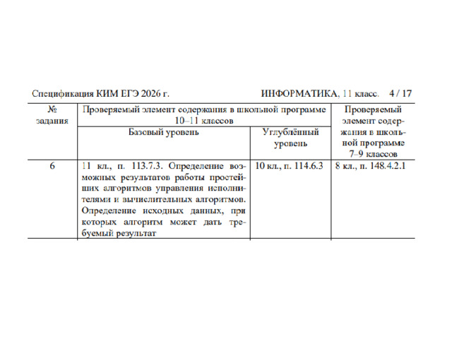 - Умение анализировать алгоритмы с использованием таблиц трассировки; определять без использования компьютера результаты выполнения несложных программ, включающих циклы, ветвления и подпрограммы, при заданных исходных данных.