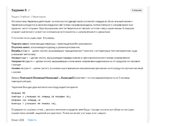 Тип 6 № 47248iИсполнитель Черепаха действует на плоскости с декартовой системой координат. В начальный момент Черепаха находится в начале координат, её голова направлена вдоль положительного направления оси ординат, хвост опущен. При опущенном хвосте Черепаха оставляет на поле след в виде линии. В каждый конкретный момент известно положение исполнителя и направление его движения. У исполнителя существует две команды: Вперёд n (где n — целое число), вызывающая передвижение Черепахи на n единиц в том направлении, куда указывает её голова, и Направо m (где m — целое число), вызывающая изменение направления движения на m градусов по часовой стрелке. Запись Повтори k [Команда1 Команда2 … КомандаS] означает, что последовательность из S команд повторится k раз. Черепахе был дан для исполнения следующий алгоритм: