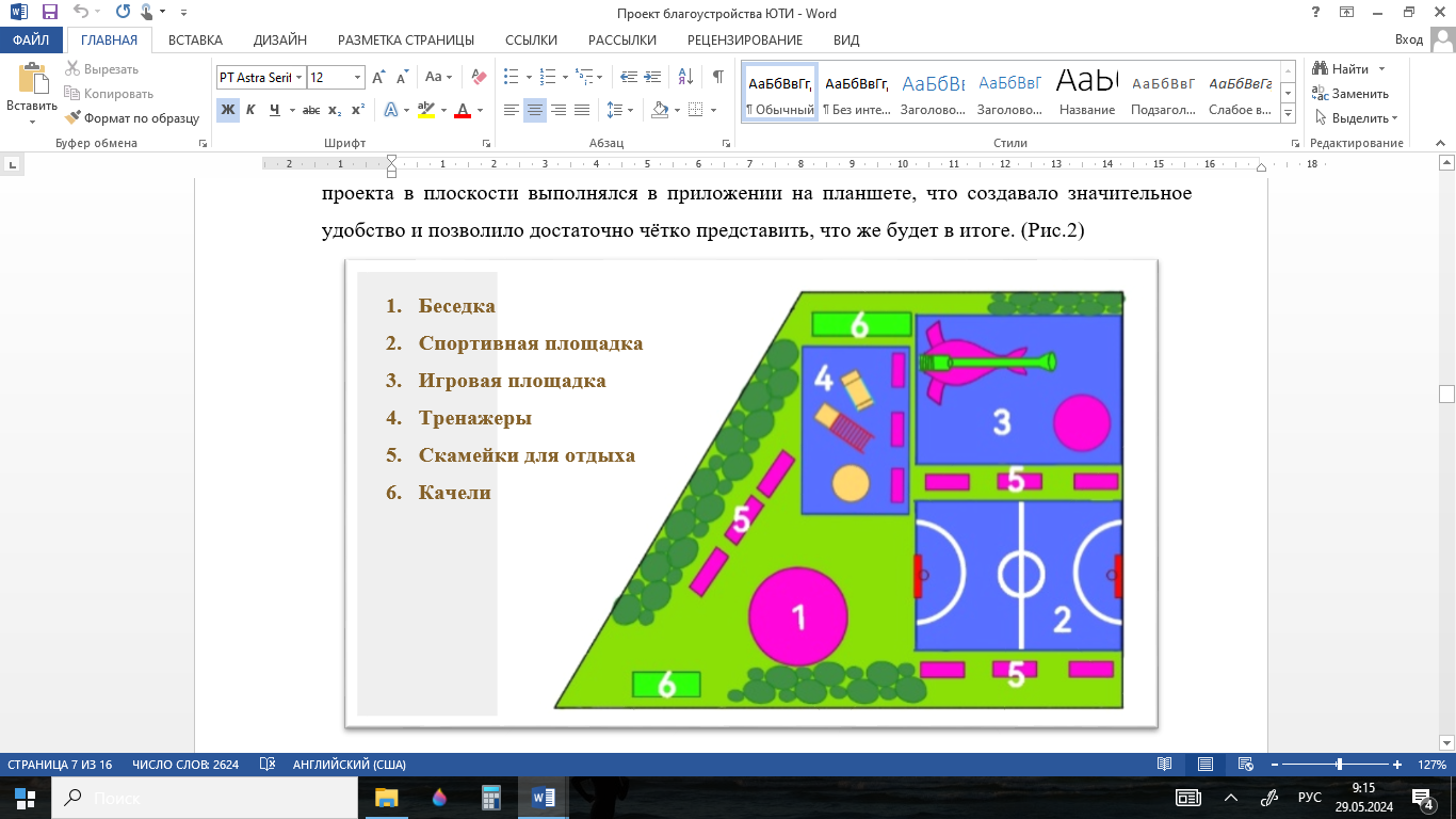 Перед нами встала задача создания эскиза проекта школьной спортивной и игровой площадок. Начать работу мы решили с разработки 2D-чертежа в известном нам приложении ibisPaint_X, которое разработано специально для удобного рисования (Приложение 3). План будущего 3D- проекта в плоскости выполнялся в приложении на планшете, что создавало значительное удобство и позволило достаточно чётко представить, что же будет в итоге. (Рис.2)