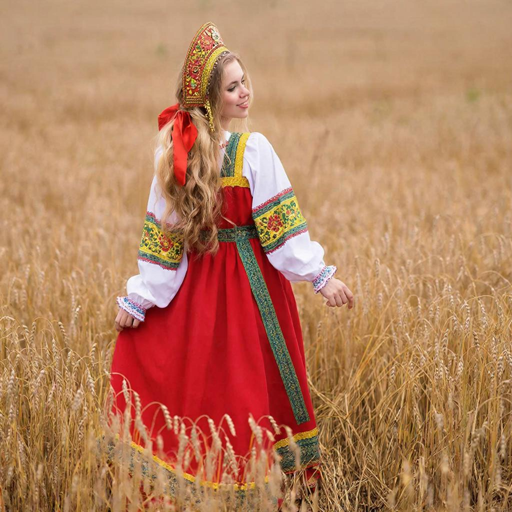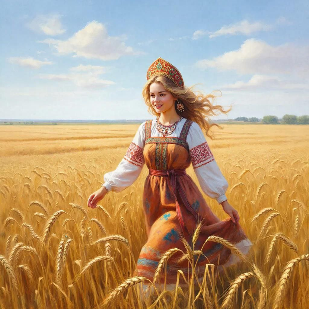 Создай фотографию девушки со светлыми волнистыми волосами, в красивом русском народном платье и кокошнике идет по полю на котором растет рожь.