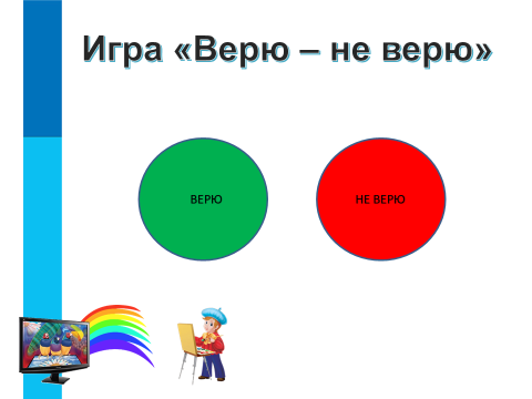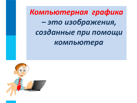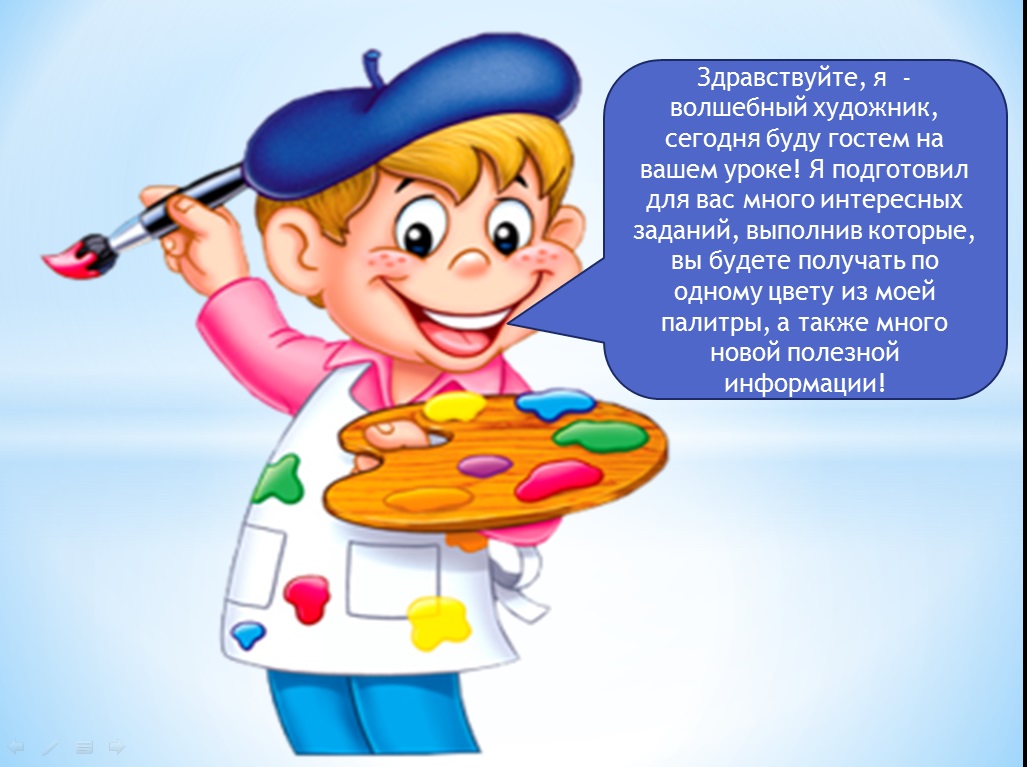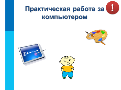 | Актуализация знаний и формулирование темы и целей урока | 7 мин | - Ребята, прежде чем познакомиться с темой сегодняшнего урока, я предлагаю вам вспомнить все то, что мы изучили на прошлом, а сделаем мы это, поиграв в игру. Игра «Информационный ком» - Я сейчас покажу на одного из вас и скажу: «Слово!», тот на кого я показала должен назвать слово, которое касается темы прошлого урока, после этого он показывает на своего одноклассника и говорит «Предложение!», второй ученик должен будет составить предложение с этим словом, третий ученик должен придумать вопрос к этому предложению, а четвертый, ответить на этот вопрос. Таким образом, мы с вами вспомним все понятия, с которыми познакомились на прошлом уроке. (Пример: Слово – текст; предложение – Текст – это определенная последовательность символов. вопрос - с помощью какого устройства можно ввести текст в компьютер; ответ – с помощью клавиатуры) - Молодцы! Все справились с заданием, пришло время получать новые знания! - Сегодня у нас на уроке будет гость, а какой вы узнаете, посмотрев на экран! (Слайд 1) - Этот веселый художник, неспроста, появился у нас на уроке, он пришел к нам не с пустыми руками, а с подарком, давайте – ка заглянем, что в коробочке? (Слайд 2) - Художник принес нам в подарок картину, но пока нес ее, краски немного размазались, давайте восстановим текст на картине и узнаем тему нашего урока. (Слайд 3) - Верно, ребята, тема сегодняшнего урока «Компьютерная графика. Графический редактор». (Слайд 4) - Наш веселый художник подготовил несколько заданий, выполнив их, вы узнаете много полезной и нужной информации. Игра «Верю не верю» (Слайд 5) - Верите ли вы, что на компьютере можно рисовать? - Верите ли вы в то, чтобы нарисовать на компьютере рисунок нужно настоящими красками водить по экрану? - Верите ли вы, что в компьютере есть специальные программы для рисования? - Верите ли вы, в то, что сегодня научитесь рисовать на компьютере? - Молодцы, но для того, чтобы научиться рисовать, вам нужно познакомиться с такими понятиями как компьютерная графика и графический редактор! | Играют в игру «Информационный ком» Слушают учителя, смотрят на экран Выполняют задание Отвечают: - «Компьютерная графика. Графический редактор» Играют в игру «Верю – не верю», отвечают на вопросы - Верим. - Не верим, потому что к экрану нельзя касаться посторонними предметами. - Верим. - Верим! |