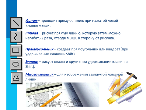 | Изучение нового материала | 10 мин | - Что же такое компьютерная графика? (Слайд 6) - Верно, компьютерная графика – это изображения, созданные при помощи компьютера. - Как вы думаете, где люди чаще всего используют ее? - Компьютерная графика имеет ряд преимуществ, в сравнении с построением изображений вручную. Какие преимущества вы можете назвать? - Действительно, компьютер является замечательным помощником для создания рисунков, но для того чтобы он смог это сделать, на нем обязательно должна быть установлена специальная программа для рисования, которая называется графическим редактором. Сегодня мы познакомимся с простейшей программой, которая позволяет обрабатывать графическую информацию – это графический редактор Paint. Чтоб открыть программу эту, Нам не нужно гулять по свету, Рассмотри РАБОЧИЙ СТОЛ, Стакан с карандашами там нашел? Дважды мышкой нажимай И программу запускай! Если нет – в меню пойдем, В ПРОГРАММАХ – СТАНДАРТНЫХ ее мы найдем! - Перед вами окно программы Paint, какие элементы вам уже знакомы или может быть встречались в других программах? (Слайд 7) - Сейчас я вам расскажу о том, для чего предназначен каждый элемент (Слайд 8,9,10) - А теперь, давайте проверим то, как вы запомнили элементы ПАНЕЛИ ИНСТРУМЕНТОВ, для этого я вам предлагаю поделиться на группы и выполнить еще одно задание от нашего гостя. Работа в группах - Художник для вас подготовил карточки, на которых изображена панель инструментов графического редактора, вы должны подписать их названия ( Приложение 1.) (Слайд 11) - Итак, первая группа справившаяся с заданием читает название элементов панели инструментов, а вторая их проверяет и если нужно, то добавляет. | Отвечают и записывают определение в тетради: - Компьютерная графика – это изображения, созданные при помощи компьютера. Отвечают на вопрос. - На компьютере рисовать удобнее; - из-за допущенной ошибки во время рисования, не нужно брать новый лист и начинать все сначала, можно просто отменить действие и т.д. - Отвечают на вопросы. Работают в группах над разгадыванием кроссворда. Читают ответы на кроссворд. |
