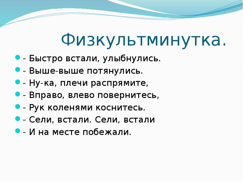 | Физкультминутка | 1 мин | Мы уже довольно долго работаем и ваши мышцы находятся в напряженном состоянии. Что нужно сделать, чтобы мышцы отдохнули? Я буду показывать движения, а вы повторяйте за мной. (Слайд 12) | Выполняют упражнения Улыбаются, тянутся вверх распрямляют плечи, повернулись вправо, повернулись влево подняли колени по очереди коснулись рук, сели, встали и бег на месте |