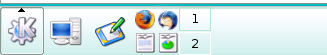 KDE поддерживает несколько виртуальных рабочих столов, переключаться между которыми можно с помощью пронумерованных кнопок, расположенных на панели (на рисунке две кнопки, хотя их количество можно изменить).