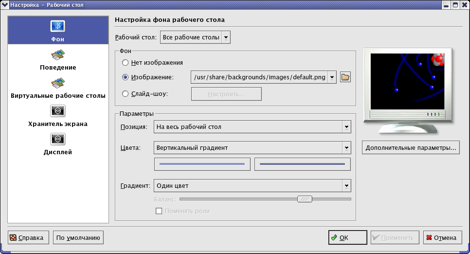 Поэкспериментируйте с фоном рабочего стола. Посмотрите варианты рисунков из списка Изображение.