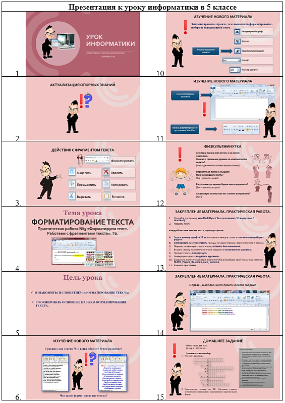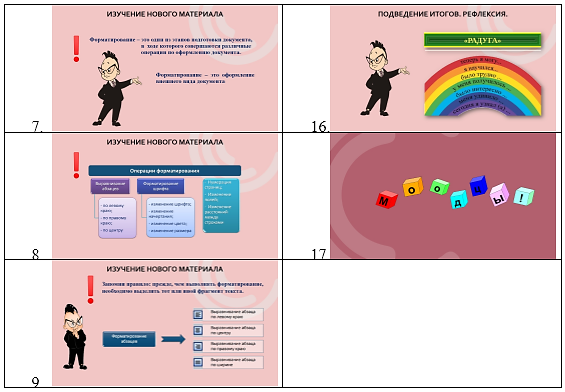 Вопросы: Этап подготовки документа на компьютере, при котором вы просматриваете его, исправляете обнаруженные ошибки и вносите необходимые изменения. Некоторое количество рядом стоящих символов, которые можно рассматривать как единое целое. Полный набор букв алфавита с общим стилем начертания. Всевозможные операции по приданию документу вида, который он будет иметь на бумаге. Более мощная, чем текстовый редактор, программа обработки текстов. Любой текст, созданный с помощью текстового процессора, вместе с включёнными в него нетекстовыми материалами. Изменение вида левого и правого краёв документа. Операция над фрагментом с целью его последующего повторения. Одна из возможных форм курсора. Практическое задание на ПК. Оформить грамоту победителю олимпиады по информатике в произвольной форме. Подведение итога урока. Рефлексия (3 мин.). ( Учитель демонстрирует лучшие работы класса и наталкивает учеников на подведение итога урока, выставляет оценки) Рефлексия. (Ребята отвечают на вопросы предложенные учителем) ВЫВОДЫ Так что же можно понимать под успешным уроком? Это урок-познание, открытие, деятельность, противоречие, развитие, рост, ступенька к знанию, самопознание, самореализация, мотивация, интерес, профессионализм, выбор, инициативность, уверенность, потребность. Для каждого учителя имеет свое, совершенно мнение. Для одних успех обеспечивается эффектным началом, буквально захватывающим учеников сразу с появлением учителя. Для других, наоборот, гораздо важнее подведение итогов, обсуждение достигнутого. Для третьих – объяснение, для четвертых – опрос и т.д. Применение новых информационных технологий позволяет каждому учителю творчески подойти к подготовке своего «идеального» урока, а обилие источников информации и доступность их – делает каждый урок творческим. Новизна современного российского образования требует личностного начала учителя, которое позволяет ему либо учить, наполняя учеников знаниями умениями и навыками, либо давать урок, развивая понимание этих знаний, умений, навыков, создавая условия для порождения их ценностей и смыслов. Создание технологической карты позволит учителю: осмыслить и спроектировать последовательность работы по освоению темы от цели до конечного результата; определить уровень раскрытия понятий на данном этапе и соотнести его с дальнейшим обучением (вписать конкретный урок в систему уроков); определить возможности реализации межпредметных знаний (установить связи и зависимости между предметами и результатами обучения); определить универсальные учебные действия, которые формируются в процессе изучения конкретной темы, всего учебного курса; соотнести результат с целью обучения после создания продукта — набора технологических карт. Преимущества технологической карты: использование готовых разработок по темам освобождает учителя от непродуктивной рутинной работы; освобождается время для творчества учителя; обеспечиваются реальные метапредметные связи и согласованные действия всех участников педагогического процесса; снимаются организационно-методические проблемы (молодой учитель, замещение уроков, выполнение учебного плана и т. д.); обеспечивается повышение качества образования. Использование технологической карты обеспечивает условия для повышения качества