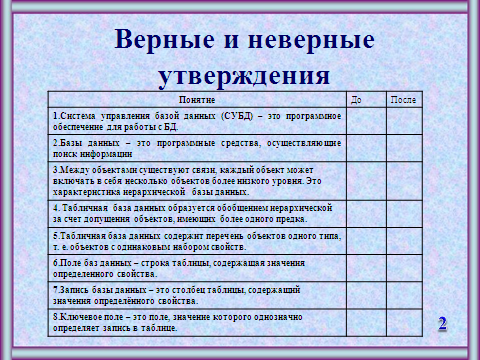 Теперь ребята вернемся к таблице «Верные и неверные утверждения» и скорректируем свои знания, заполним второй пустой столбец.