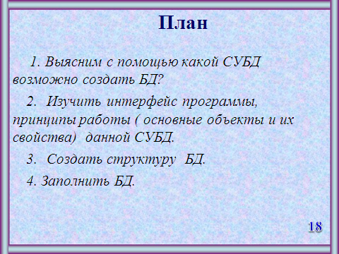 Мы будем создавать БД данных с помощью специального офисного приложения – назначение которого создание и работа с базами данных , входящего в состав Microsoft office - (Эксес).