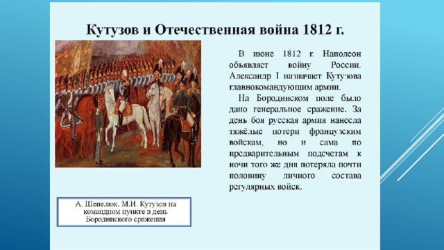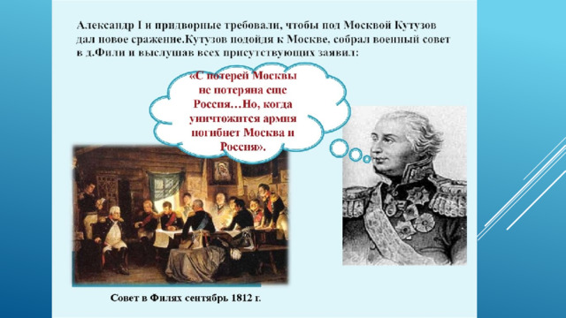 молодых советников настоял на проведении генерального сражения. Кутузов возражал, но не сумел отстоять