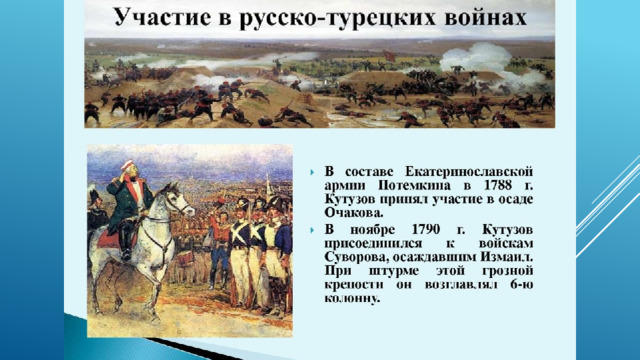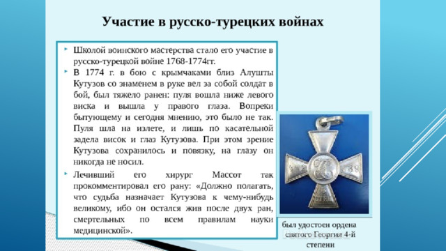 24 июля 1774 при ликвидации турецкого десанта под Алуштой Кутузов, командуя гренадерским