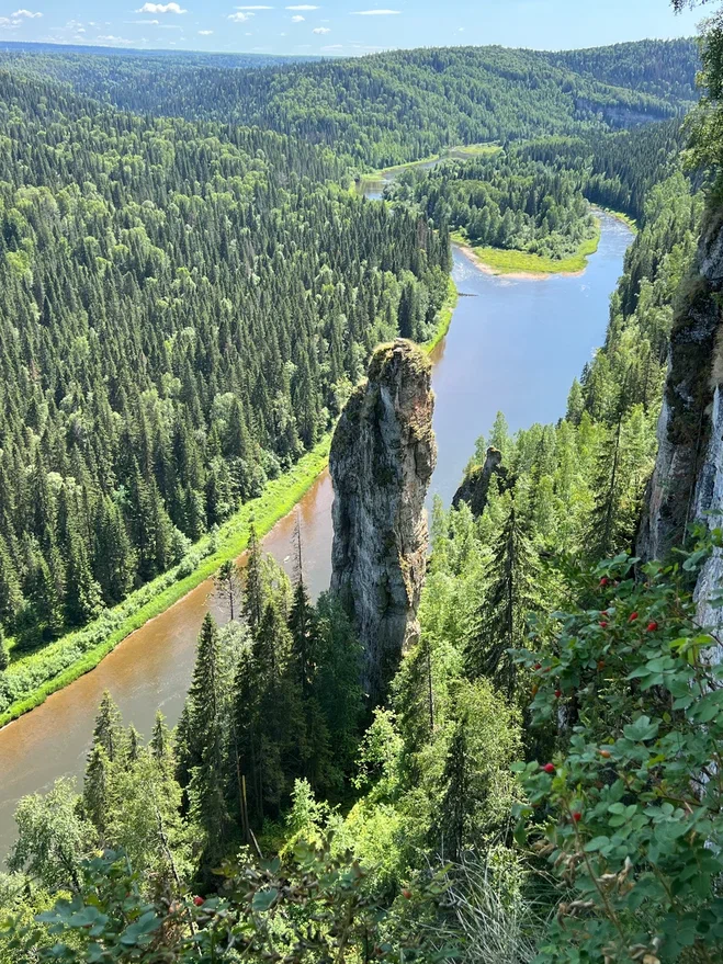 Огромные скалы стоят рядами вдоль излучины Усьвы, река внизу петляет, как в гравюре. По одну сторону — сосновый лес, по другую — голые каменные стены. И среди них — странная, отдельно стоящая скала, похожая на вытянутый палец. Тонкая, высокая, будто выточенная вручную. Это — Чертов Палец. Это самая узнаваемая точка Усьвинских столбов. 70‑метровый отдельно стоящий столб, сужающийся к основанию. Эрозия отделила его от основного массива, в результате получился действительно впечатляющий пейзаж.