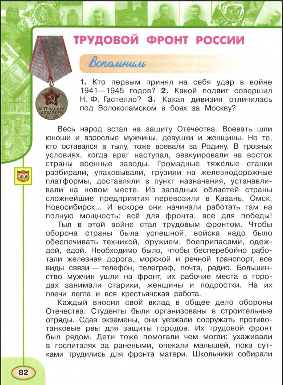 | 4. Работа по теме | - Сегодня на уроке мы поговорим о важной странице истории нашей страны – о трудовом фронте времён Великой Отечественной войны. Вы, конечно, знаете, что это была война, очень страшная и тяжёлая. Но помимо сражений на полях боя, шёл ещё один, не менее важный, фронт – трудовой. Представьте себе: мужчины ушли на войну, защищать Родину. А кто же будет работать в городах и сёлах? Кто будет производить оружие, одежду, еду для солдат и для всех остальных? Этот огромный труд лег на плечи женщин, детей, стариков. Они работали на заводах, в колхозах, в шахтах, строили дороги и мосты, лечили раненых. Это был невероятно тяжёлый труд, часто в голоде и холоде, под постоянными бомбёжками. - Героизм в тылу не уступал героизму на фронте. Люди работали круглосуточно, часто под открытым небом, в лютые морозы. Значительное количество оборудования располагалось в неприспособленных помещениях. Рабочие стремились дать больше продукции фронта. Как вы думаете почему? - Каждый выкованный снаряд, каждый выращенный колосок пшеницы приближали долгожданный день победы. - Ребята, приведите примеры. Что производили люди, работающие в сёлах и городах? - А кто, в основном, трудился в тылу, если почти все мужчины ушли на войну? - Где работали люди на трудовом фронте? - Что они делали? - Почему люди, работающие на трудовом фронте тоже считаются героями? - Чтобы лучше разбираться в этой теме, давайте прочитаем первые 2 абзаца на с. 82 учебника про себя. Даю пару минут. - Перечислите, кто шёл защищать Отечество? - Найдите и прочитайте, что делали с громадными станками? - В какие города перевозили предприятия? - Под каким девизом они начинали работать там? - Чем в этой войне стал тыл? - Чем необходимо было обеспечить войска, чтобы оборона была успешной? - Что для этого было необходимо? - Кто занял рабочие места мужчин? - Читаем следующие 2 абзаца на с. 82-83. Даю пару минут - Чем помогали подростки во время войны? - Какой вклад вносили дети? - Что делали школьники? Прочитайте в тексте. - Какую надпись делали на бутылках? | Слушают материал - Потому что понимали: от их труда зависела победа над врагом - Оружие, одежду, еду для солдат и всех остальных - Женщины, дети, старики - На заводах, в колхозах, в шахтах, больницах - Строили дороги и мосты, лечили раненых - Потому что они работали круглосуточно, и в мороз, и в жару, и под открытым небом без еды, воды. - Весь народ: юноши, взрослые люди, девушки и женщины. - Громадные тяжёлые станки разбирали, упаковывали, грузили на жд платформы, доставляли в пункт назначения, устанавливали на новом месте. - В Казань, Омск, Новосибирск - Всё для фронта, всё для победы! - Трудовым фронтом - Техникой, оружием, боеприпасами, одеждой, едой. - Необходимо было, чтобы бесперебойно работали железная дорога, морской и речной транспорт, все виды связи – телефон, телеграф, почта, радио. - Старики, женщины и подростки. - Они были организованы в строительные отряды, сдав экзамены, уезжали сооружать противотанковые рвы для защиты городов. - Ухаживали в госпиталях за ранеными, опекали малышей, пока сутками трудились для фронта матери. - Собирали бутылки. Заполняли их горючей смесью, закупоривали и отсылали в воинские части. Бутылка становилась грозным оружием против танков. - «Как Гитлер не хвалится, а под Москвой завалится.» | Познавательные: знаково-символические средства (логические 