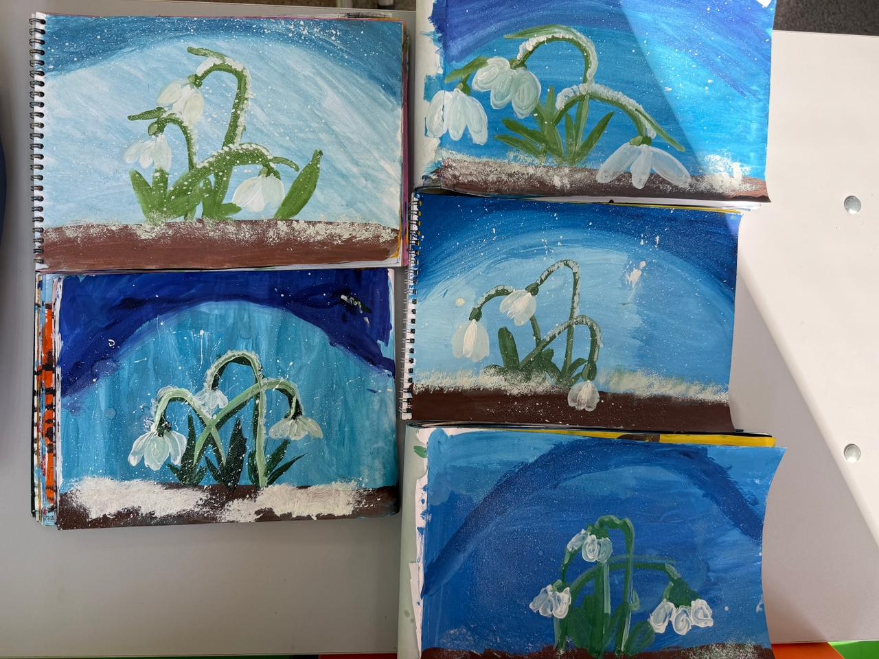 Этапы рисования: Фон: поролоновой губкой нанести на лист оттенки синего цвета (смешать синий с белым и немного с чёрным), создавая эффект рыхлого снега. Внизу — темнее, к верху — светлее. Впадинка в снегу: добавить в синий цвет ещё чёрного и заполнить середину листа овалом — это место, откуда будут расти подснежники. Передний край впадинки проработать белой краской жёсткой кистью, показывая хрустящий снег. Листья: кистью № 3 нарисовать узкие острые зелёные листья (движения снизу вверх). Использовать разные оттенки зелёного (добавить белый и жёлтый). Стебли и чашелистики: тонкой кистью № 1 нарисовать тонкие слегка наклоненные стебельки и округлые чашелистики. Цветки: белой гуашью кистью № 3 изобразить цветки. Каждый цветок состоит из трёх длинных наружных лепестков и трёх коротких внутренних (можно использовать приём примакивания). Во время работы звучит музыка П. И. Чайковского «Подснежник». Педагог оказывает индивидуальную помощь детям, напоминает о правильной осанке и аккуратности.